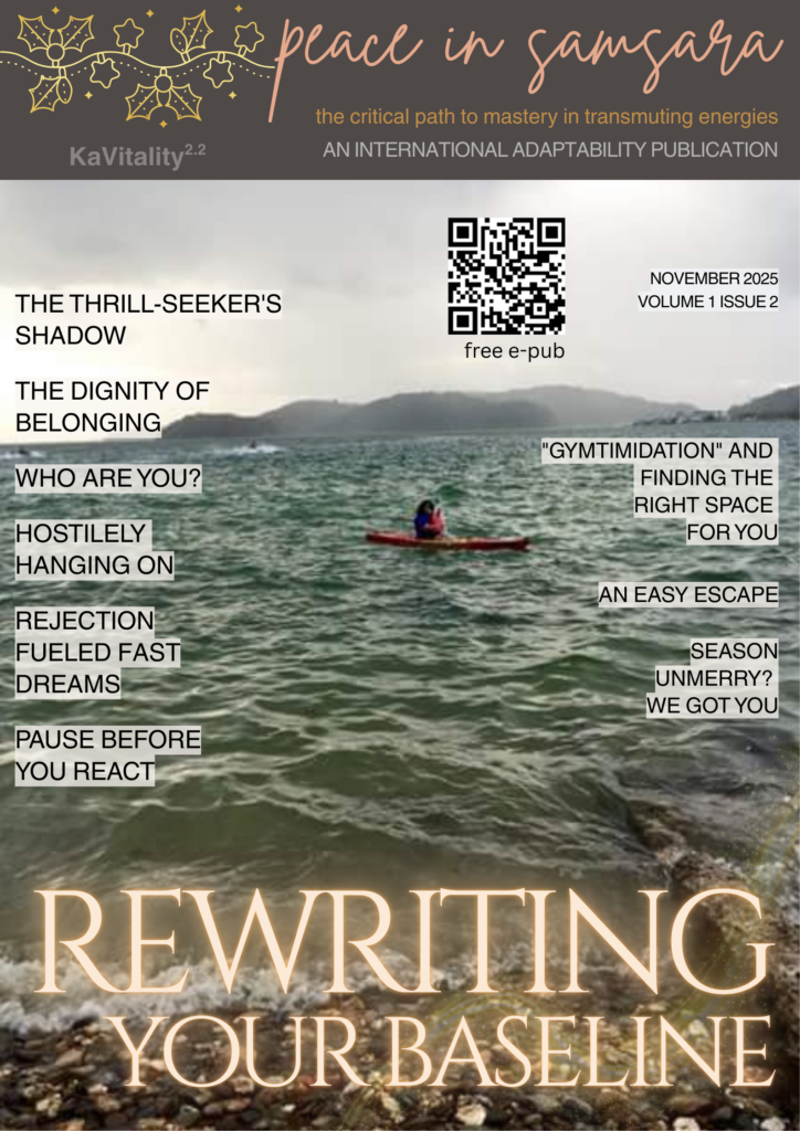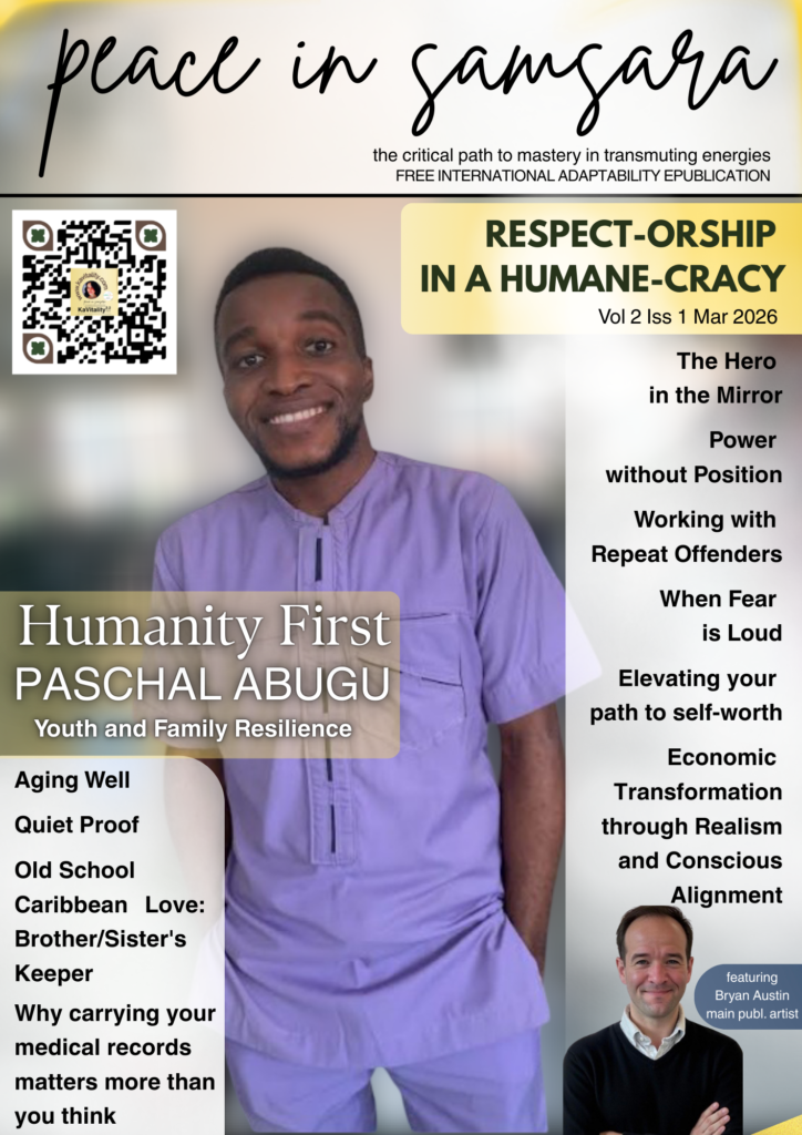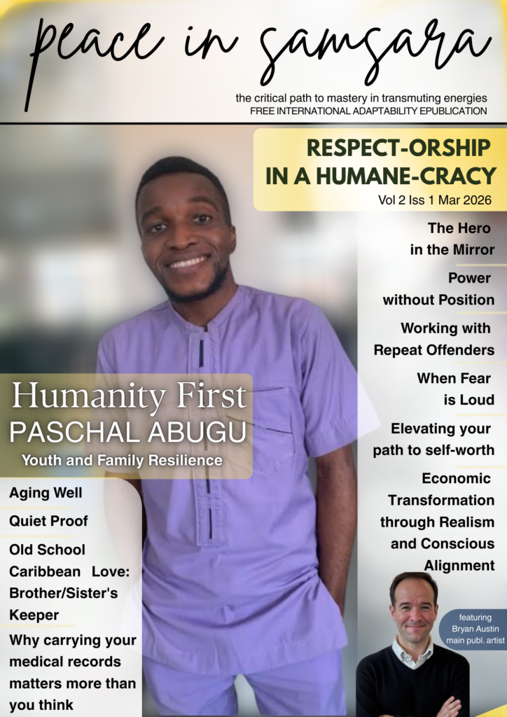 Peace in Samsara is a free online international adaptability publication (8 – Mar | Aug | Nov) that began in August 2025. Our objective is to build a community; foster strong validation, companionship; empathy, give support, encouragement to real experiences as we grow together towards a higher purpose, driven by a greater vision, and focus on building a better world without conscious harm (adding value or neutral)… we build on a foundation of diplomacy | conscious sharing and expression | self-honor | grounded-ness | humility | real connection and collaboration. Peace in Samsara is meant to teach staying alive – and allowing the “suicide” to be of attitudes, behaviours, beliefs, thoughts, patterns, etc. that do not serve our highest good.